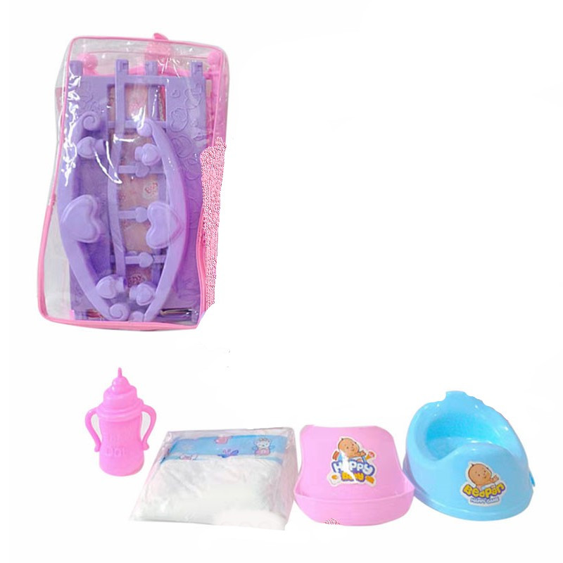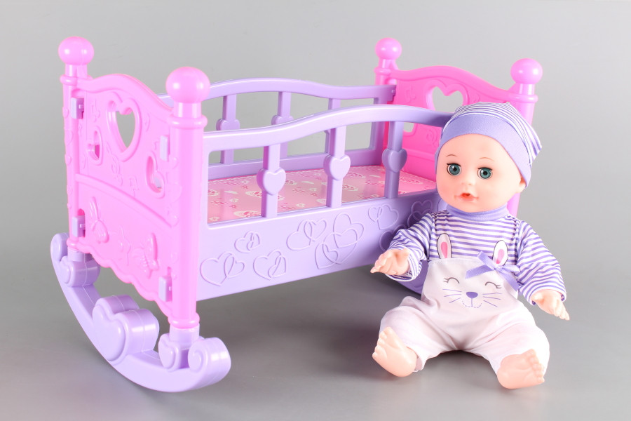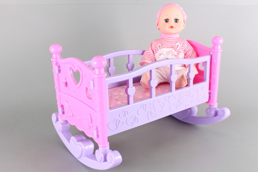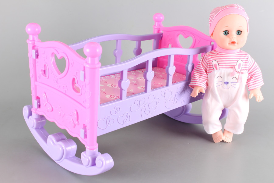 Пишкаща кукла бебе, люлеещо се легло и аксесоари.