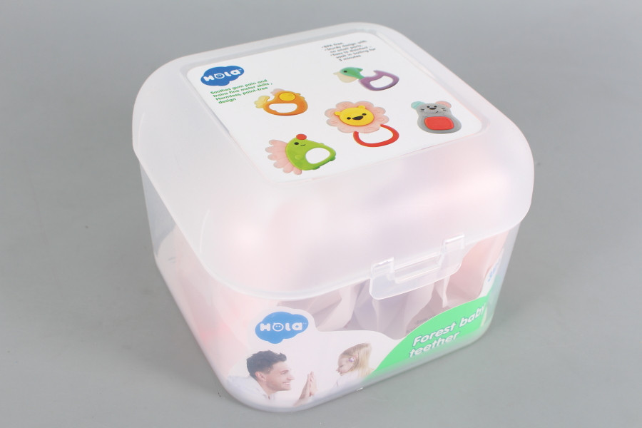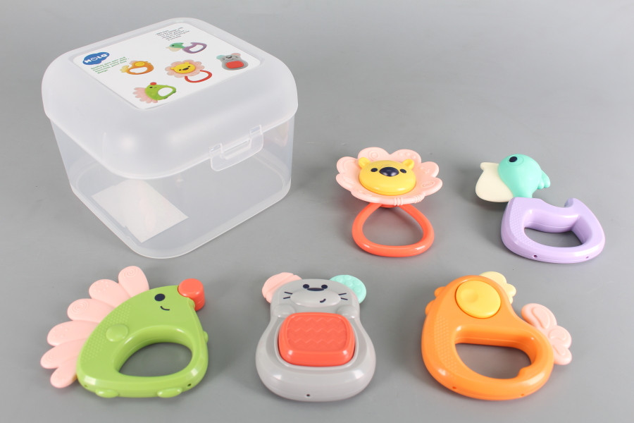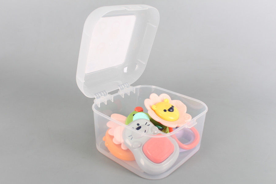 Комплектът съдържа 5 бебешки гризалки - чесалки и удобна кутия за съхранението им.