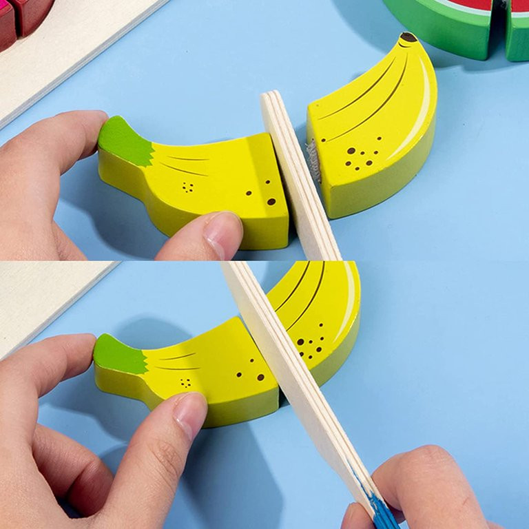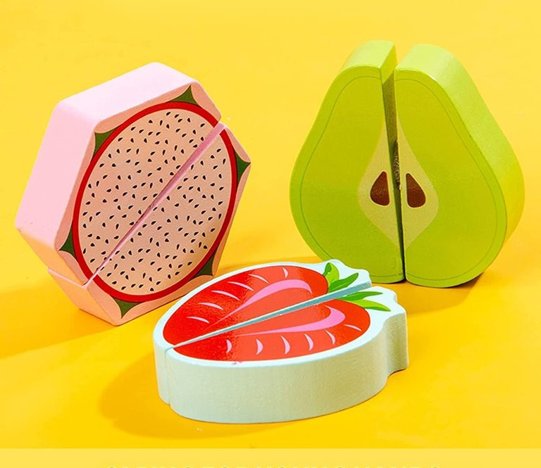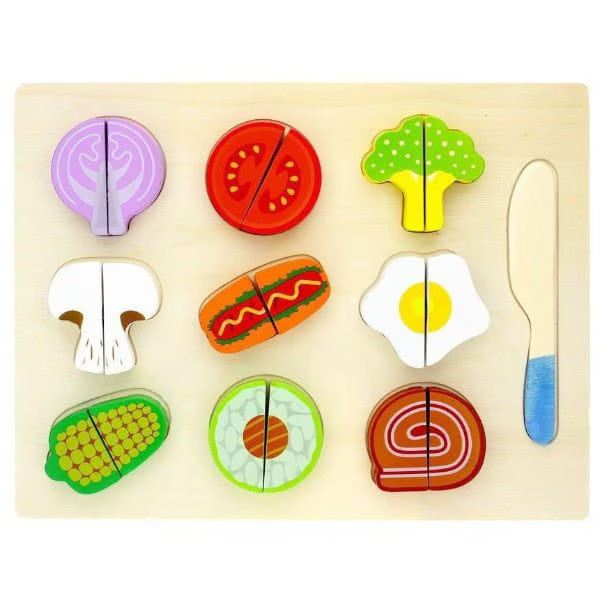Комплектът съдържа макети на хранителни продукти, ножче и табличка.