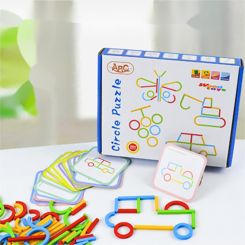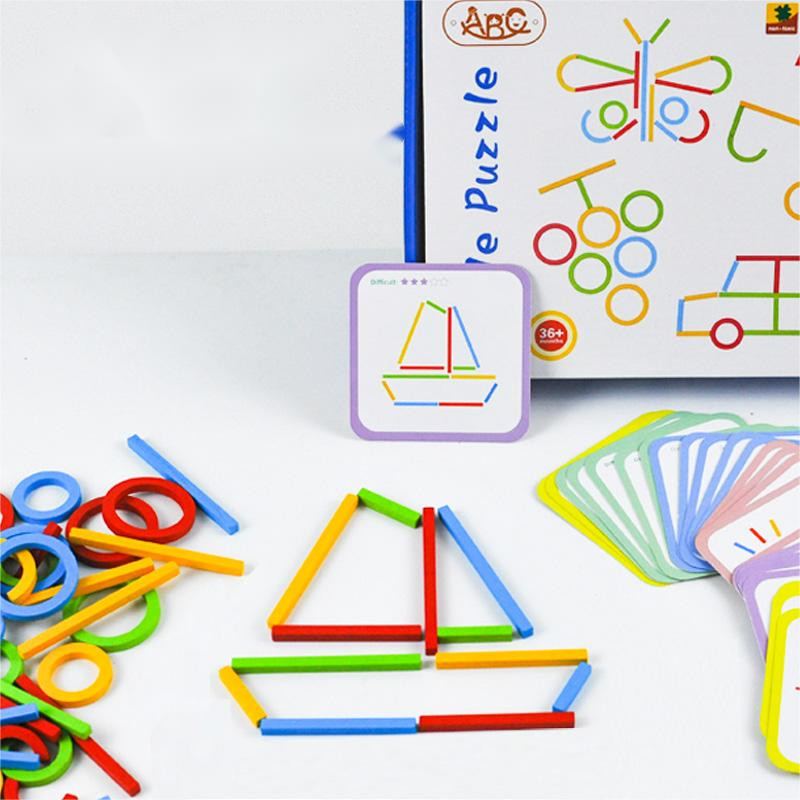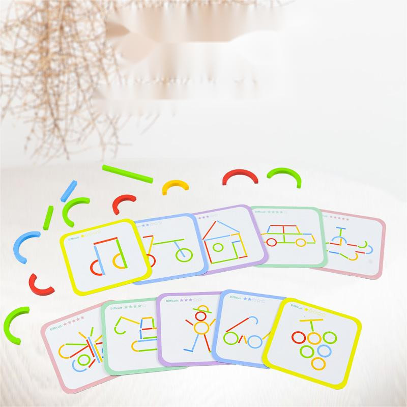 Дървен комплект за рисуване с различни по цвят и форма елементи и карти с примерни картинки.