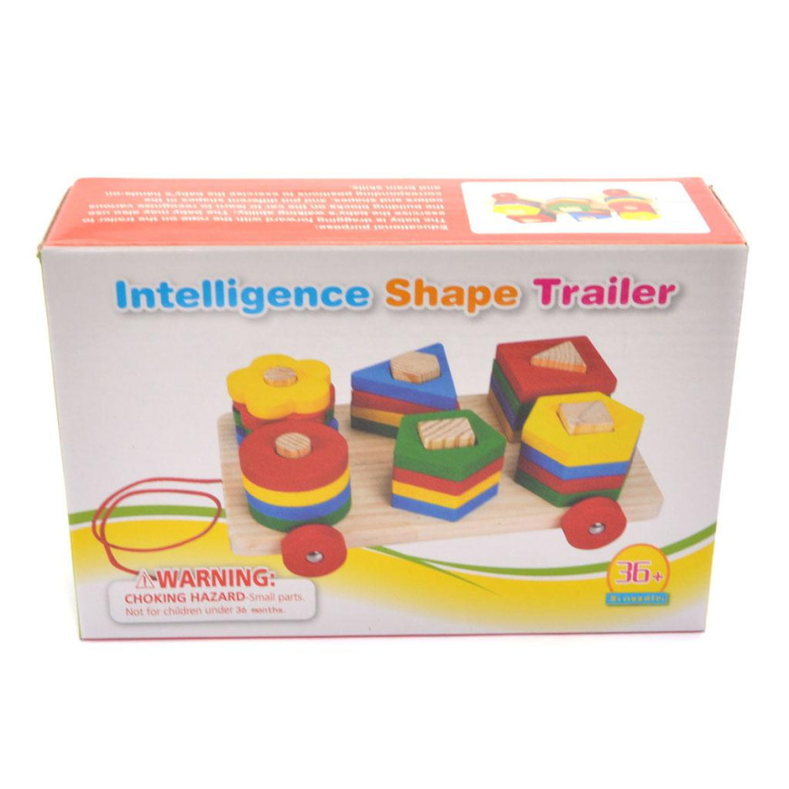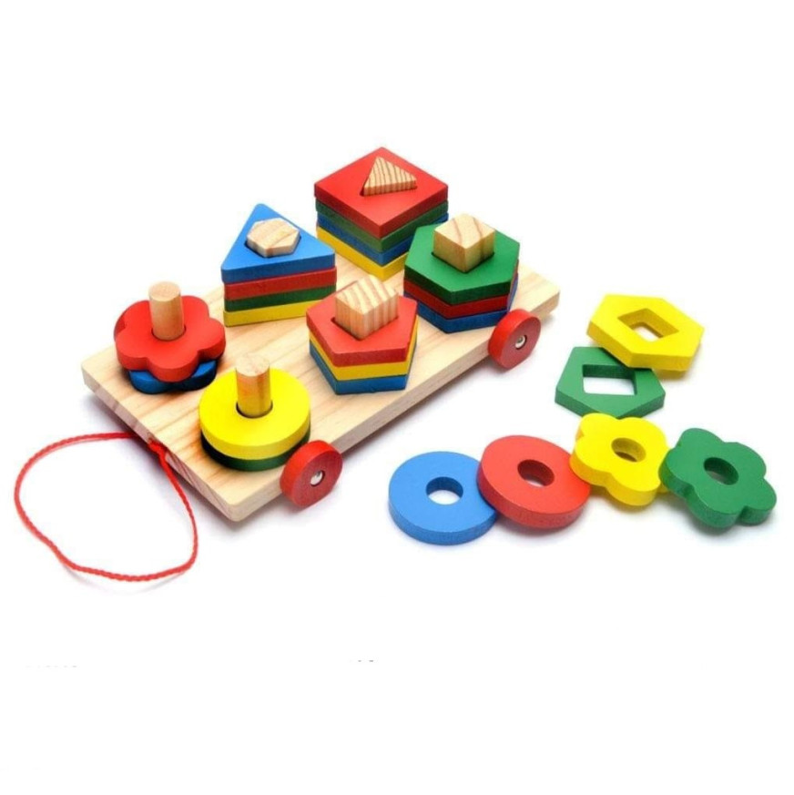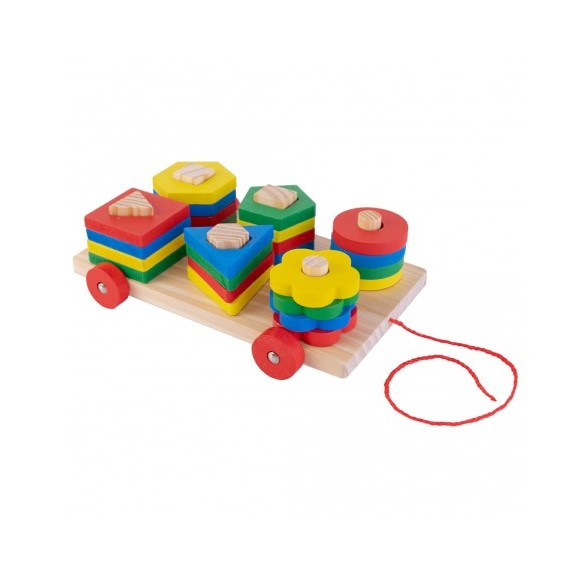 Комплектът съдържа 24 различни цветни форми за нанизване и количка с въженце за дърпане.