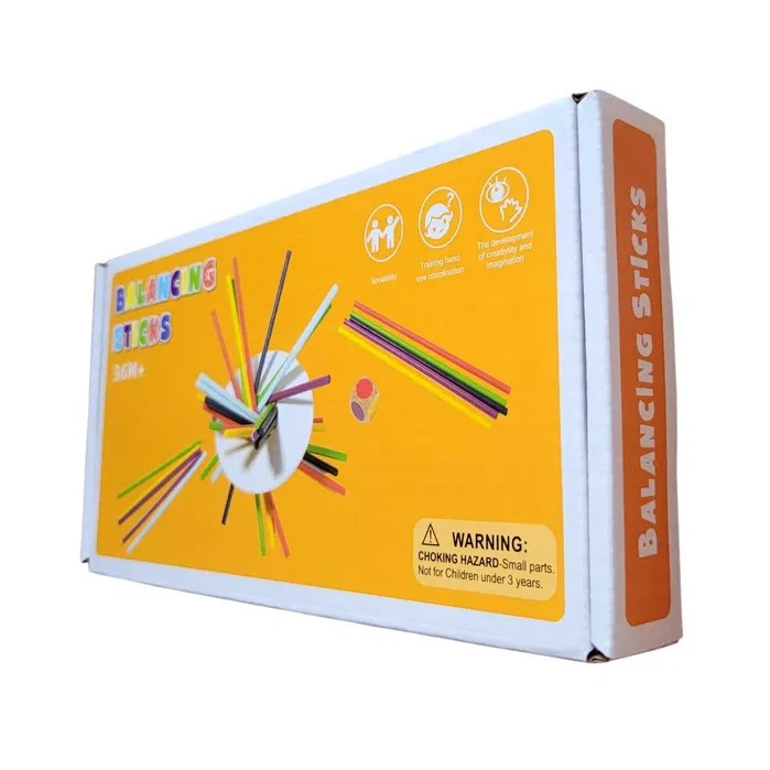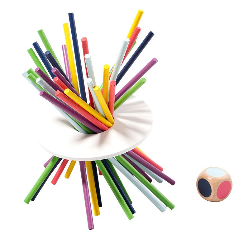 Комплектът съдържа 30 цветни клечки, зар и пръстен за захващане на пръчките.