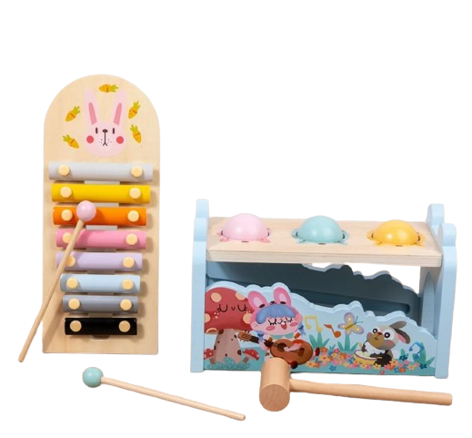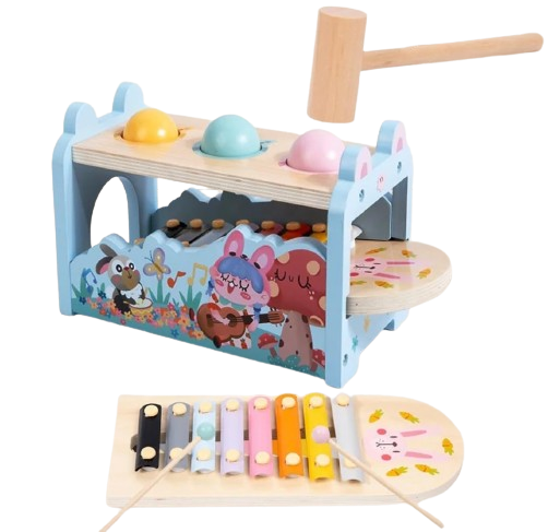 Дървена интерактивна играчка с чукче, топки и ксилофон