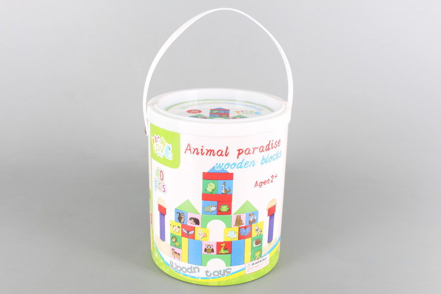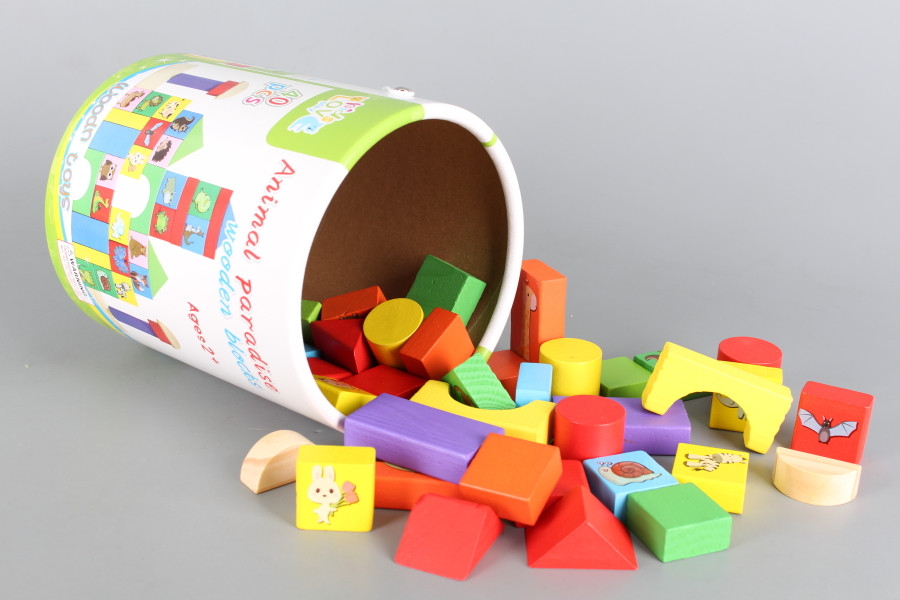 Комплектът съдържа дървени елементи с различна форма, големина и цвят и картонена кутия с пластмасови капак и дръжка.