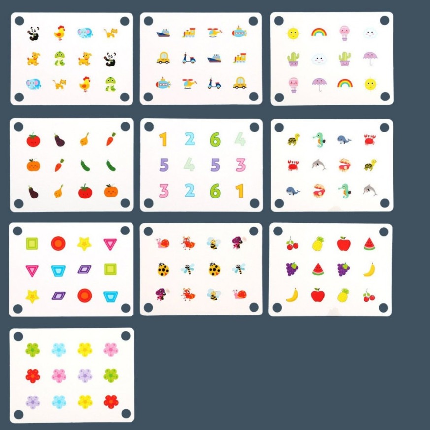 - 5 двустранни карти, всяка с различна категория картинки (животни, форми, цветове, плодове, цифри и др.)