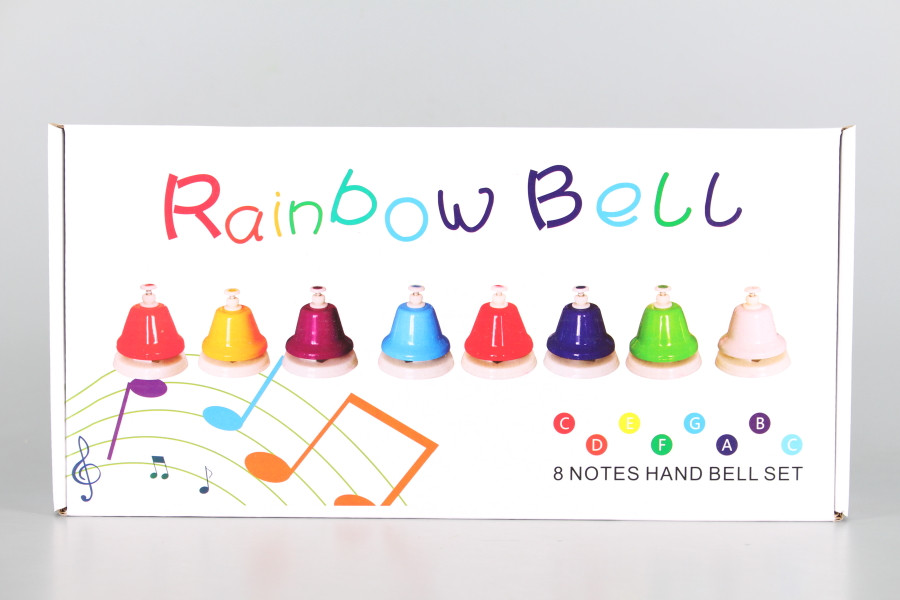 Комплектът съдържа 8 броя метални камбанки с пластмасови основи и дръжки.
