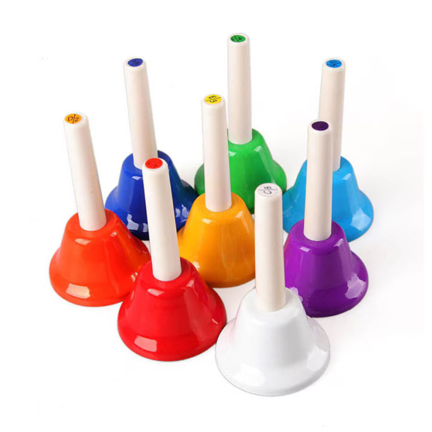 Комплект от 8 броя метални камбанки с пластмасови дръжки.
