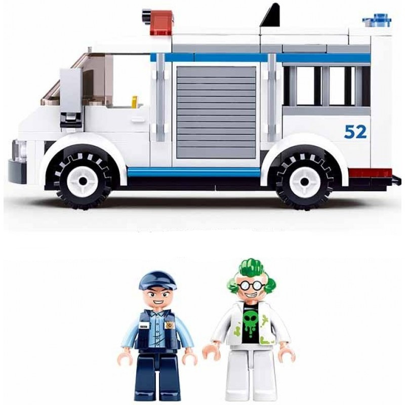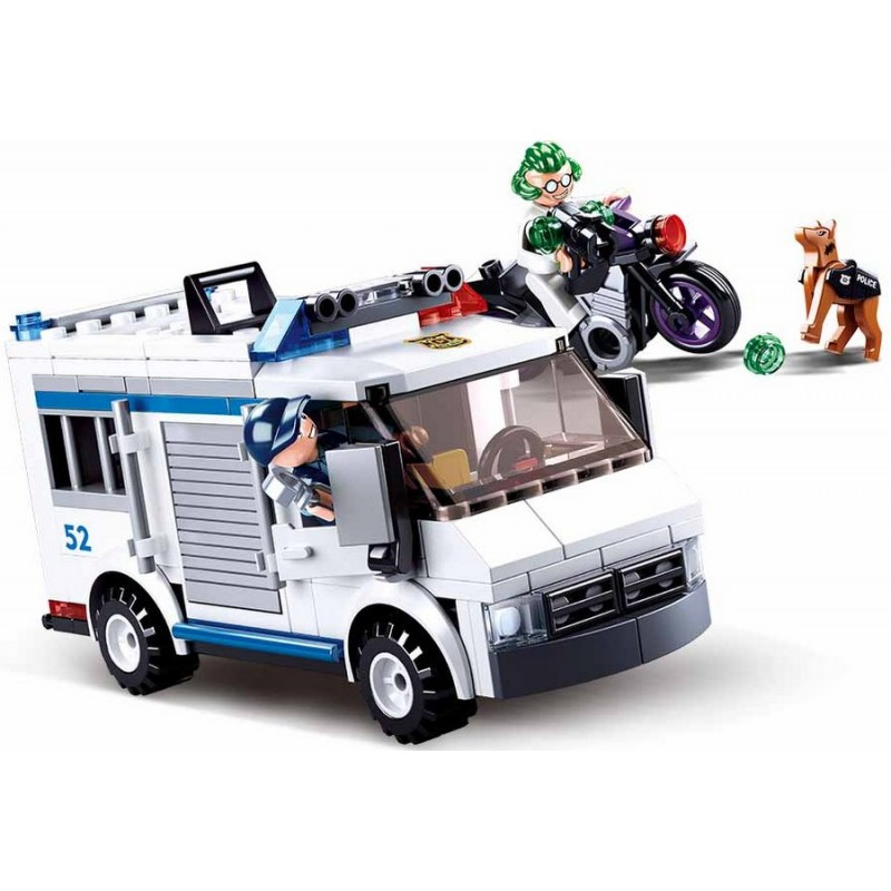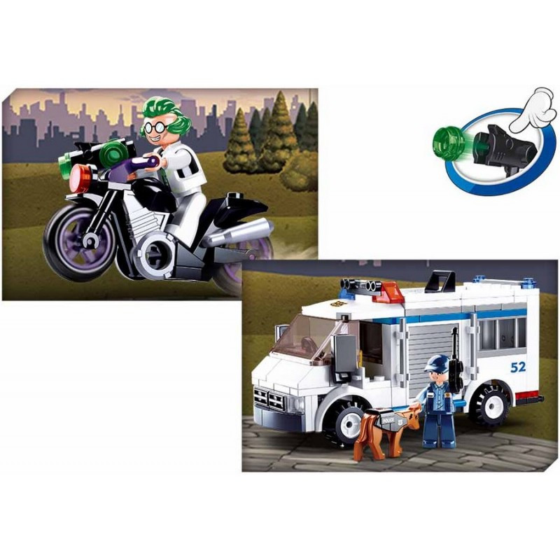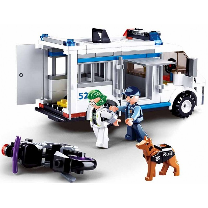 Детски конструктор от 117 елемента за построяване на полицейски арестантски камион, мотор, моторист, полицай и куче.