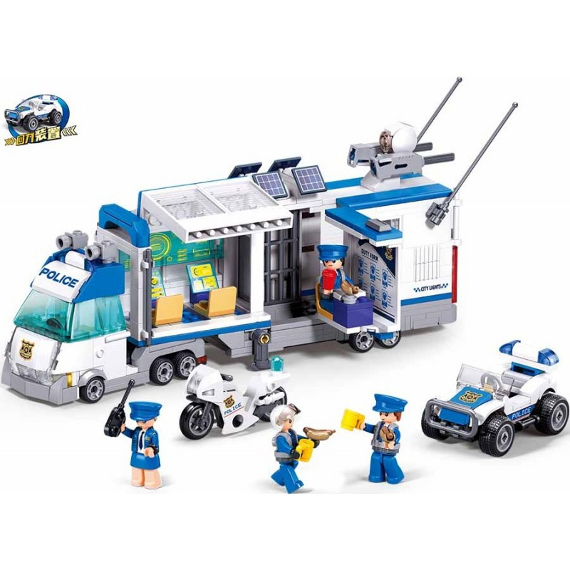 Детски конструктор от 510 елемента за построяване на камион полицейски команден щаб, джип, мотор и 4 фигурки на полицаи.