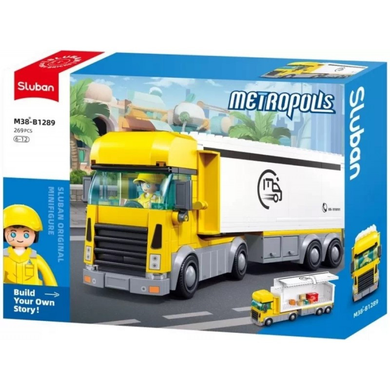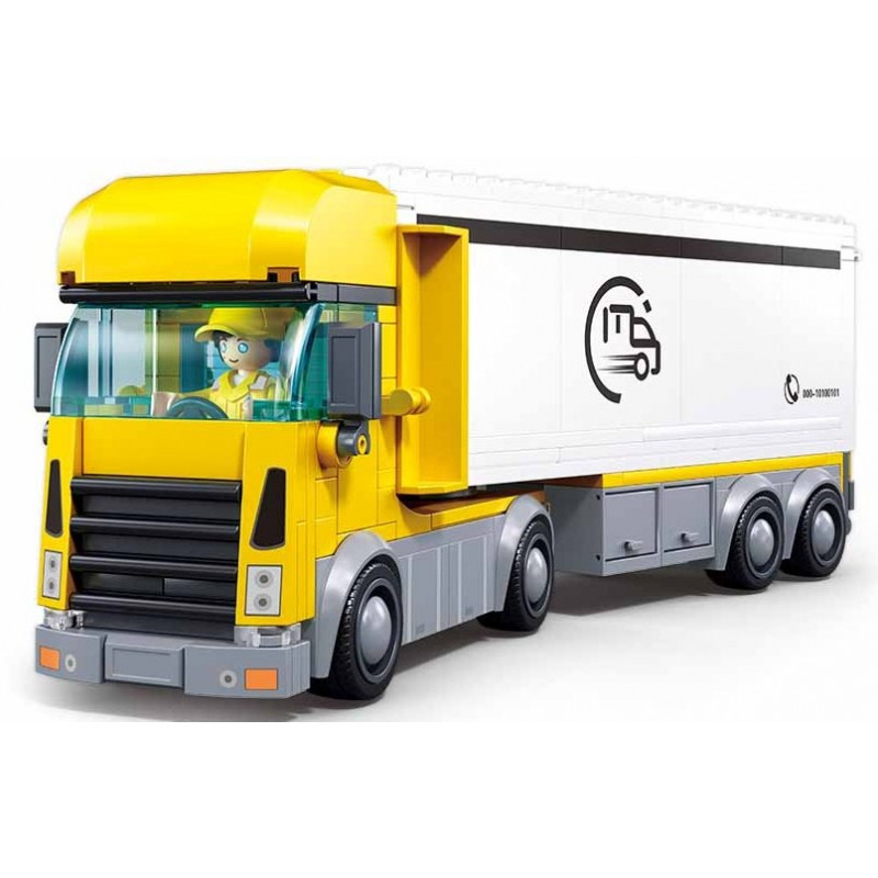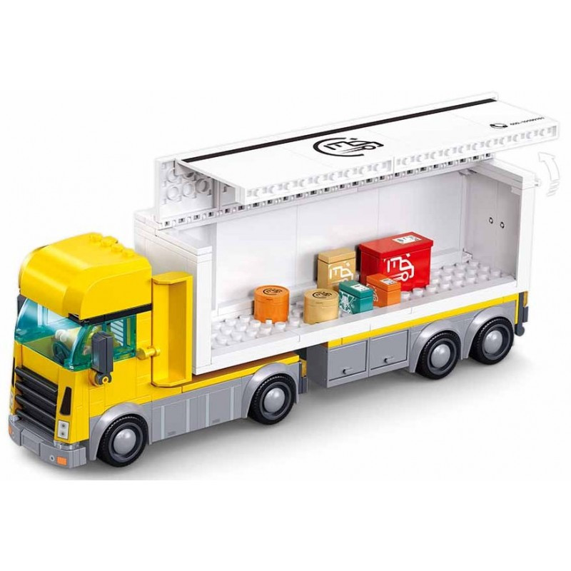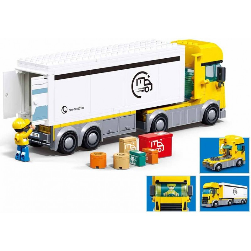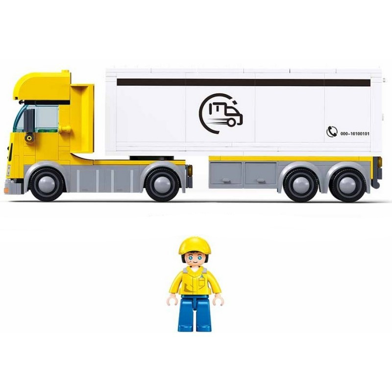 Детски конструктор от 269 елемента за построяване на камион с фургон за доставки и фигурка на един работник.