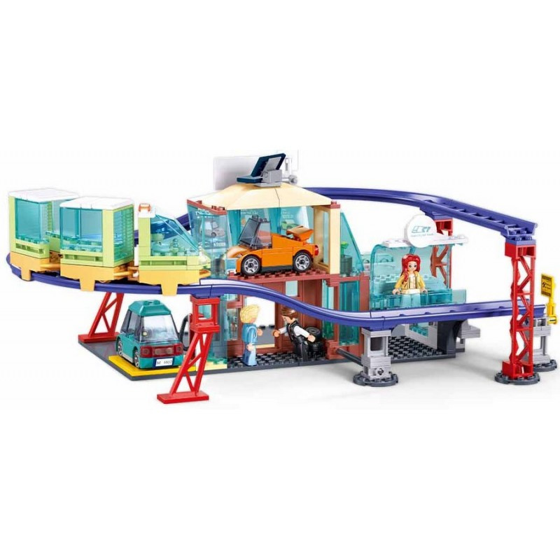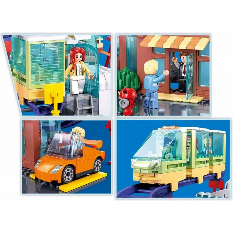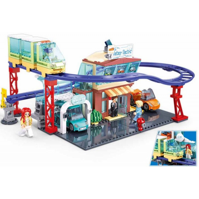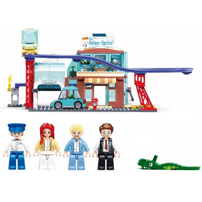 Детски конструктор от 379 елемента за построяване на магазин за електрически коли, зарядна станция и 4 човечета.