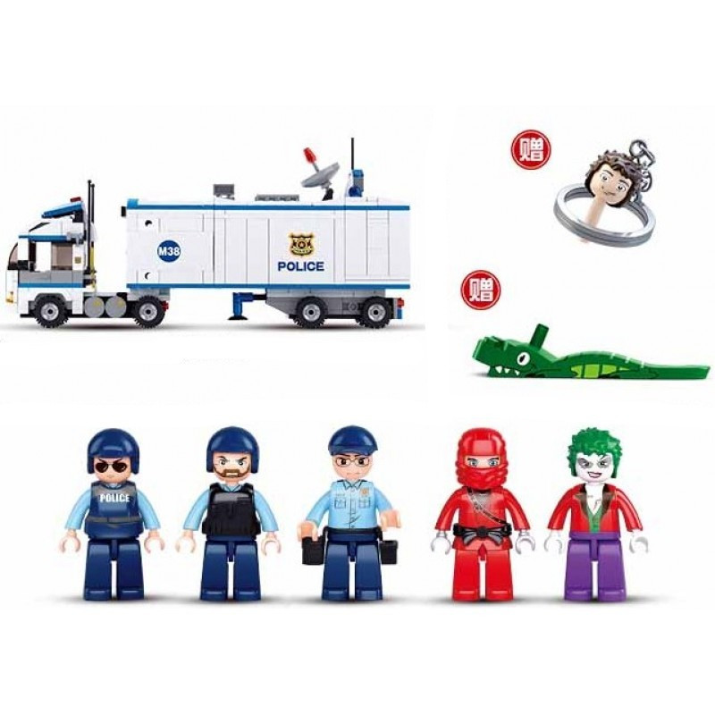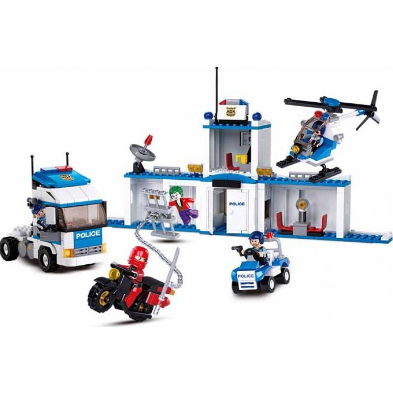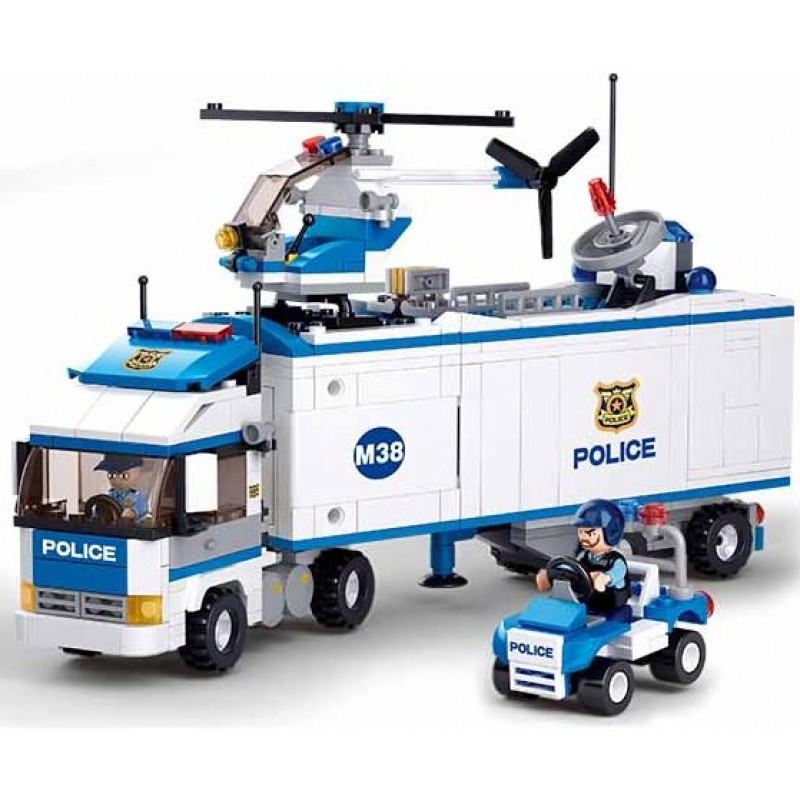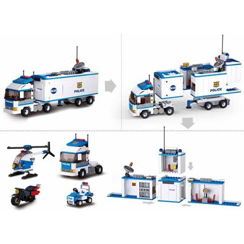 Детски конструктор от 572 елемента за построяване на оперативен полицейски камион, хеликоптер, мотор, джип и 5 фигурки на полицаи и престъпници.