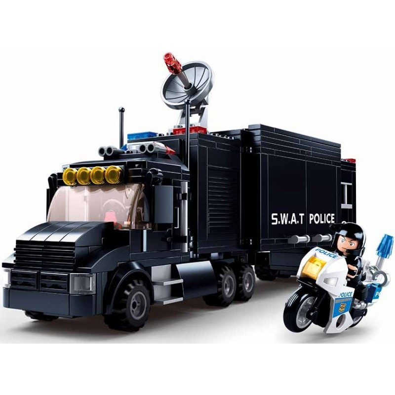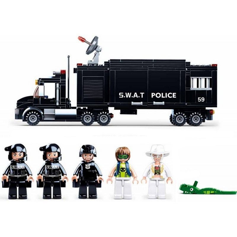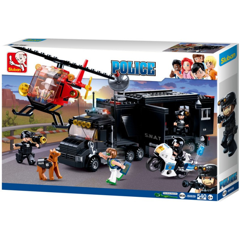 Детски конструктор от 540 елемента за построяване на оперативен полицейски камион, хеликоптер, мотор и 5 фигурки на полицаи и престъпници.