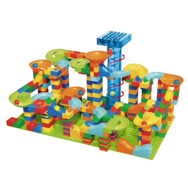 Комплектът е набор от ярко оцветени блокчета и части, които децата могат да използват, за да построят вълнуваща писта с топчета.