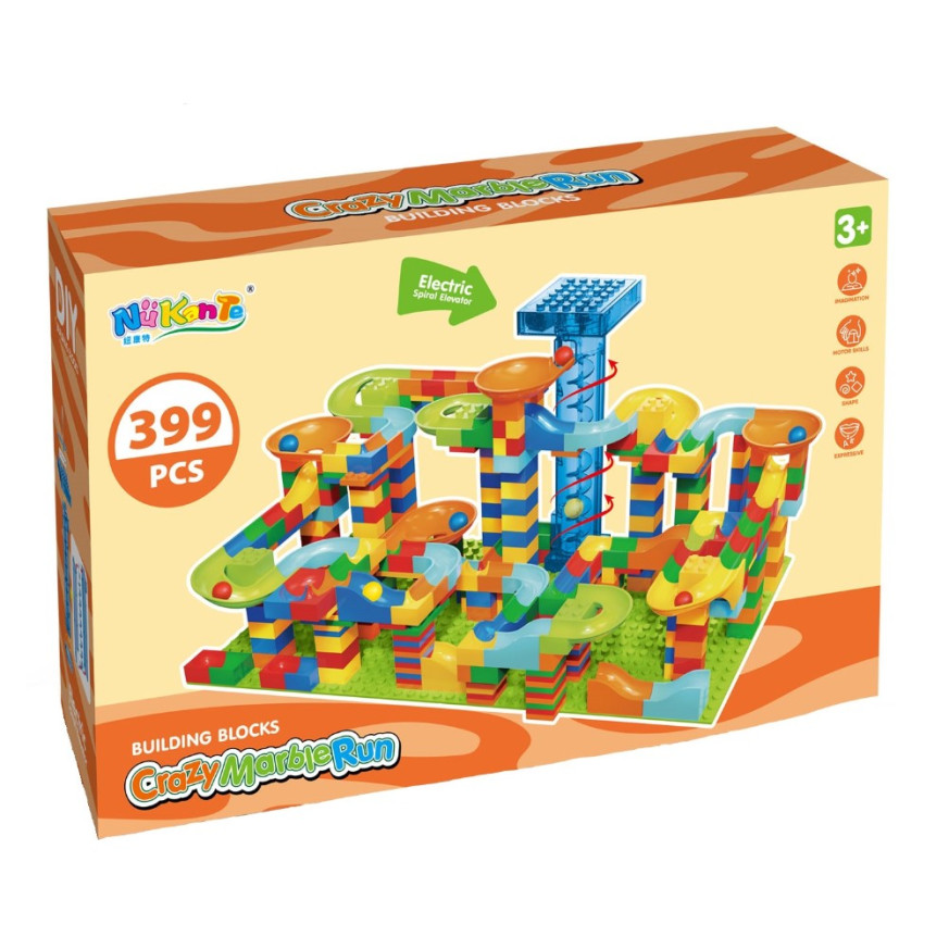 Комплектът съдържа 399 елемента за сглобяване на път за спускане на топчета.
