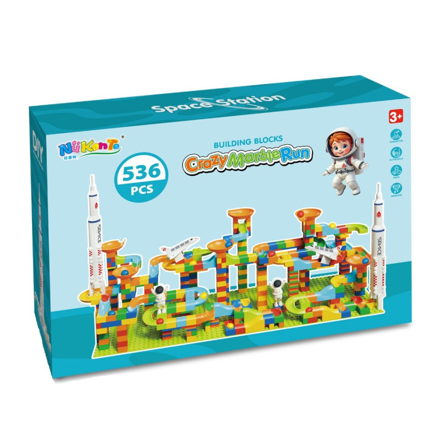 Комплектът съдържа 536 елемента за сглобяване на път за спускане на топчета с тема Космос.
