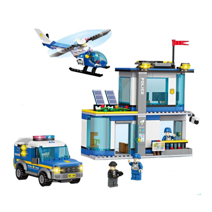 Детски конструктор от 497 части за построяване на полицейска станция и полицейски джип.
