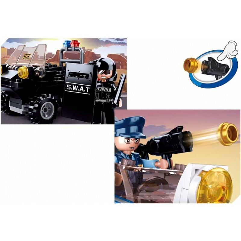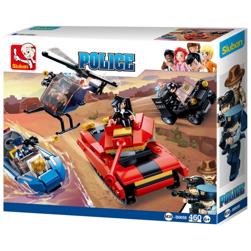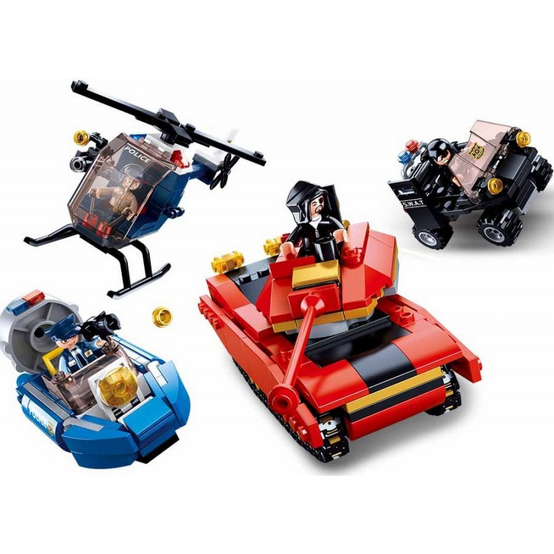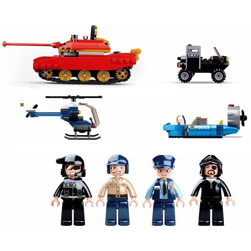 Детски конструктор от 460 елемента за построяване на танк, хеликоптер, лодка, джип и 4 фигурки на човечета.