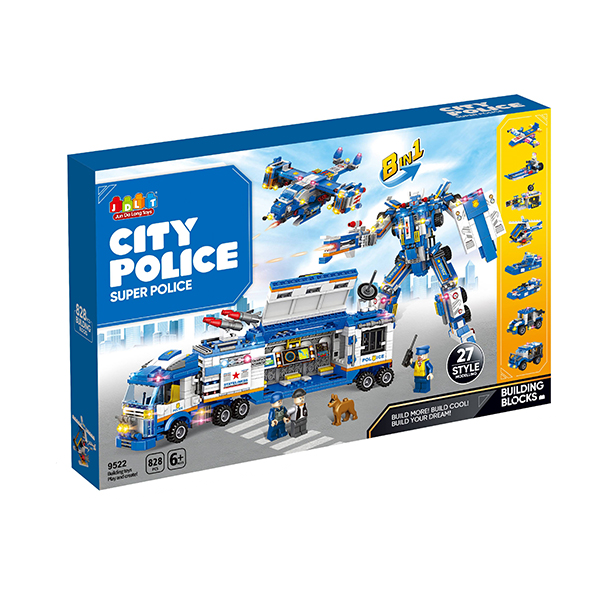 - 828 елемента на конструктор за сглобяване на осем различни вида превозни средства или три различни форми - полицейски камион, робот или самолет (не и трите едновременно),