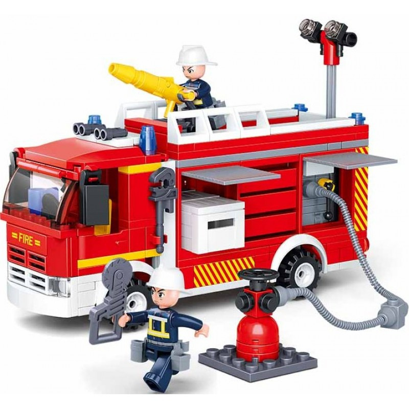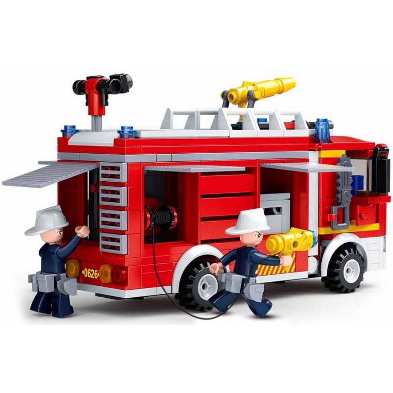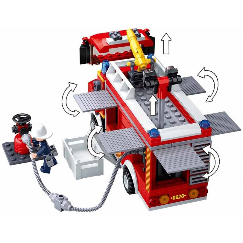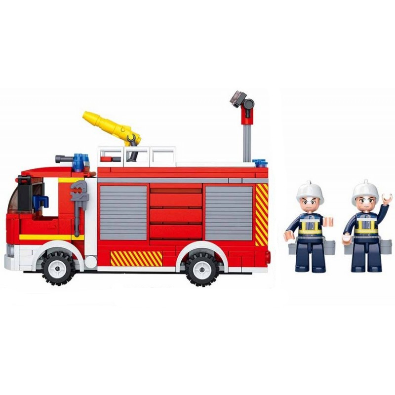Детски конструктор от 343 елемента за построяване на пожарен камион и две фигурки на пожарникари.