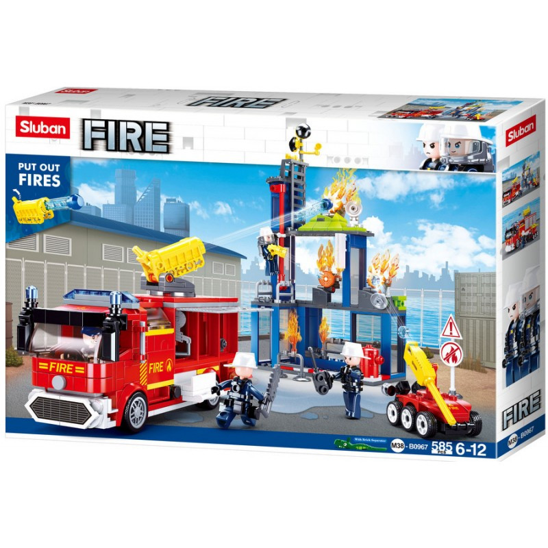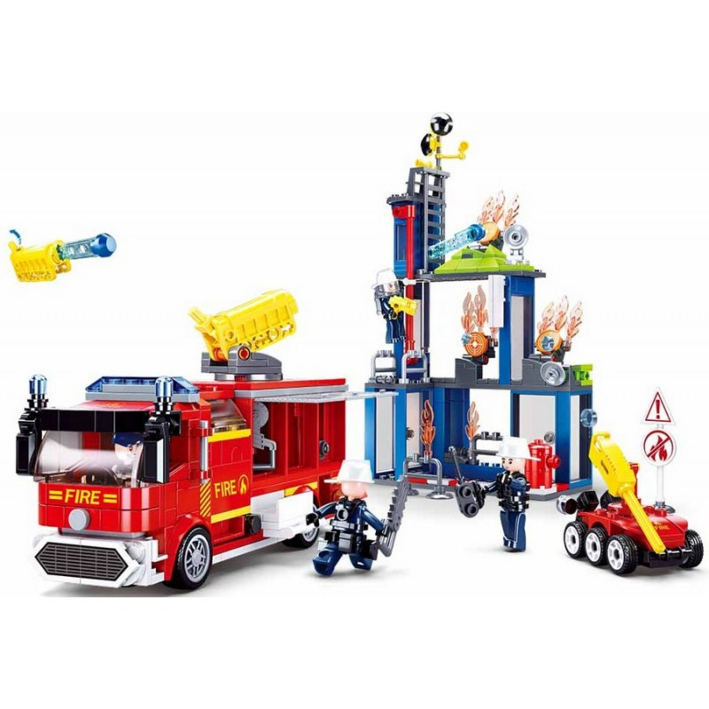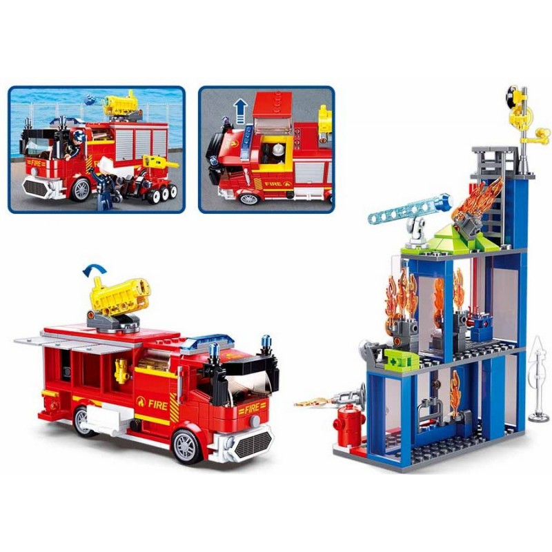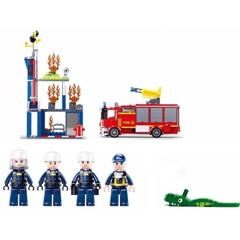 Детски конструктор от 585 елемента за построяване на пожарен камион, пожарна тренировъчна сграда и 4 фигурки на пожарникари.