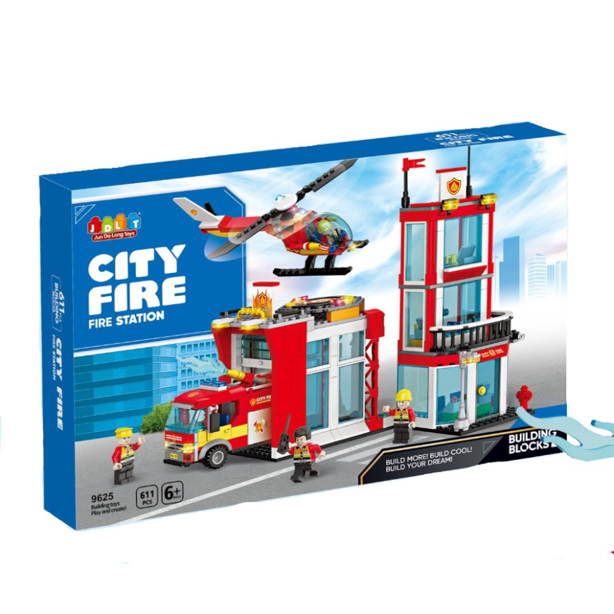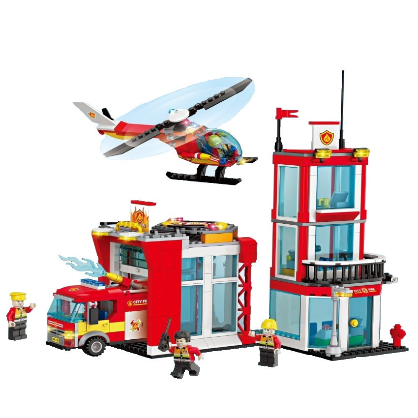 Детски конструктор от 611 части за построяване на пожарна станция, пожарна кола и хеликоптер.