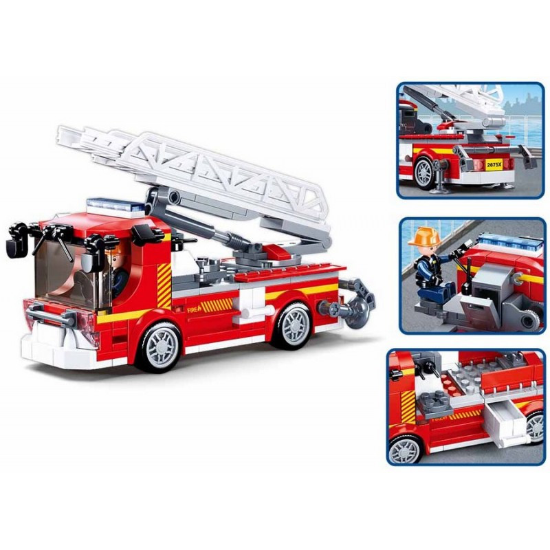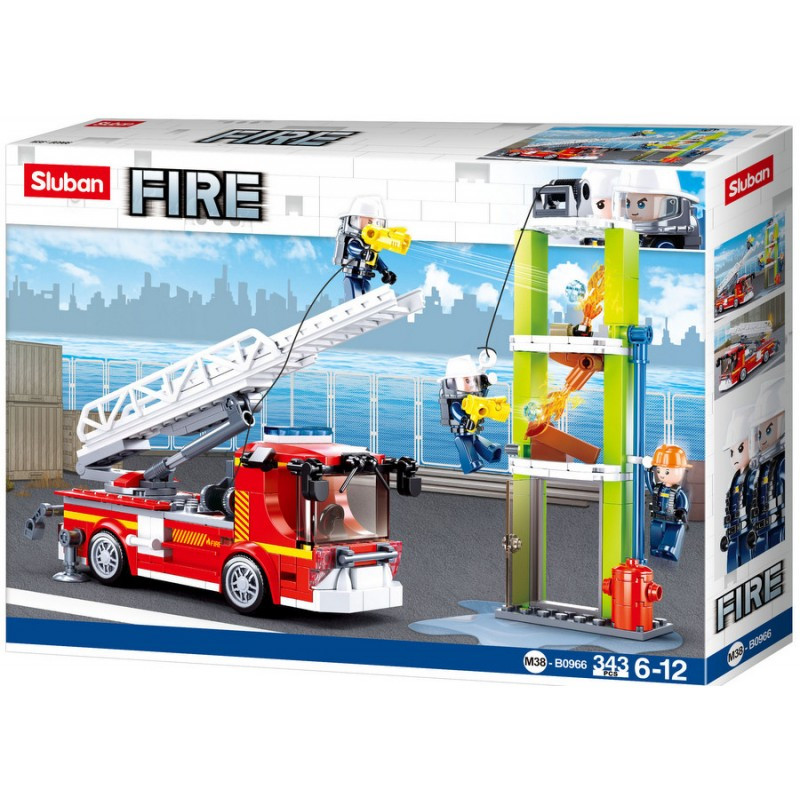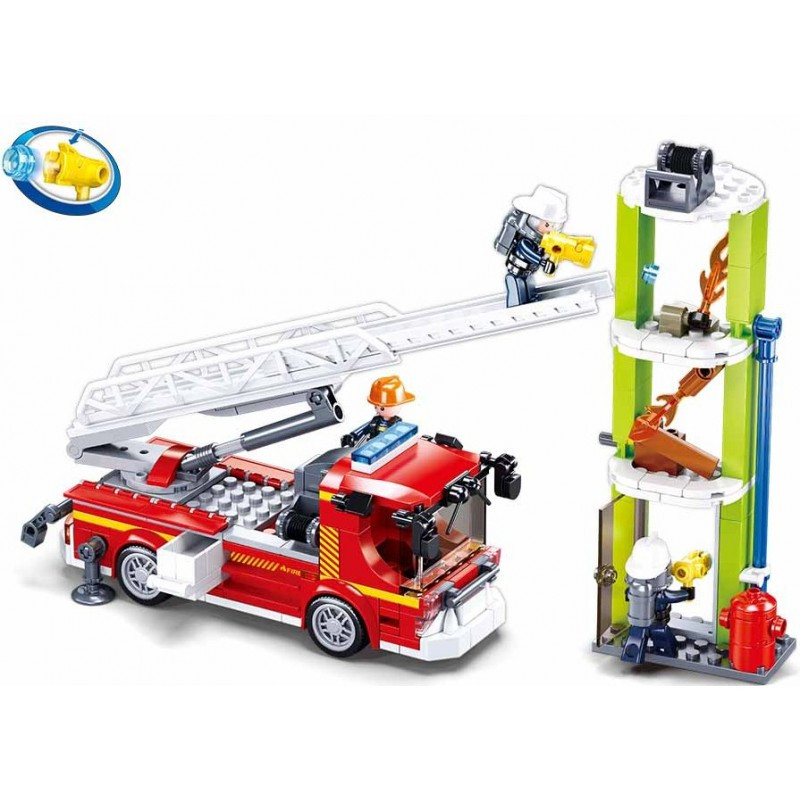 Детски конструктор от 343 елемента за построяване на пожарен камион със стълба, пожарна тренировъчна кула и три фигурки на пожарникари.