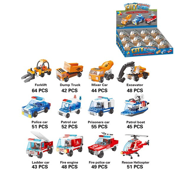 Комплектът съдържа елементи на конструктор за сглобяване на превозно средство (42 - 64 части в зависимост от модела).
