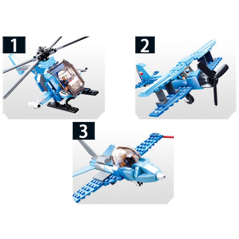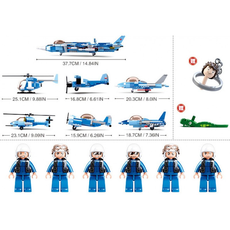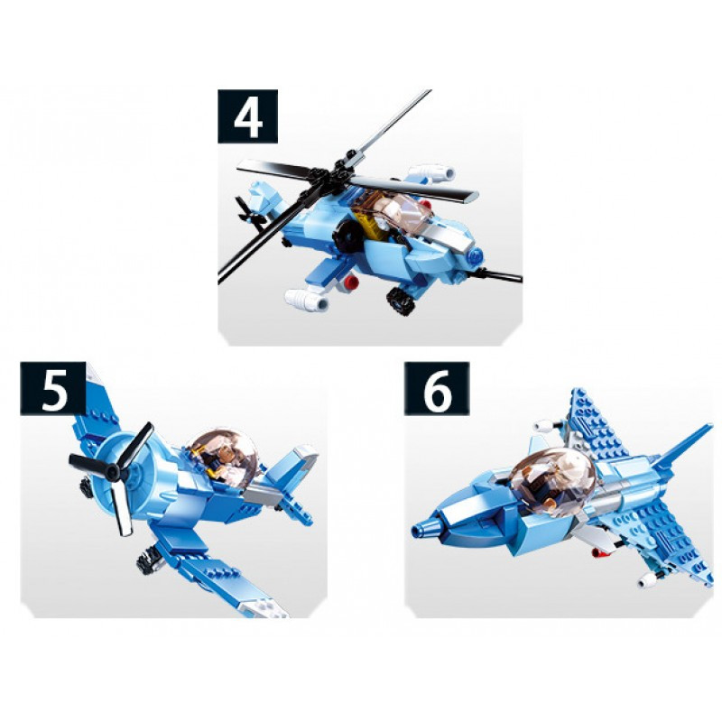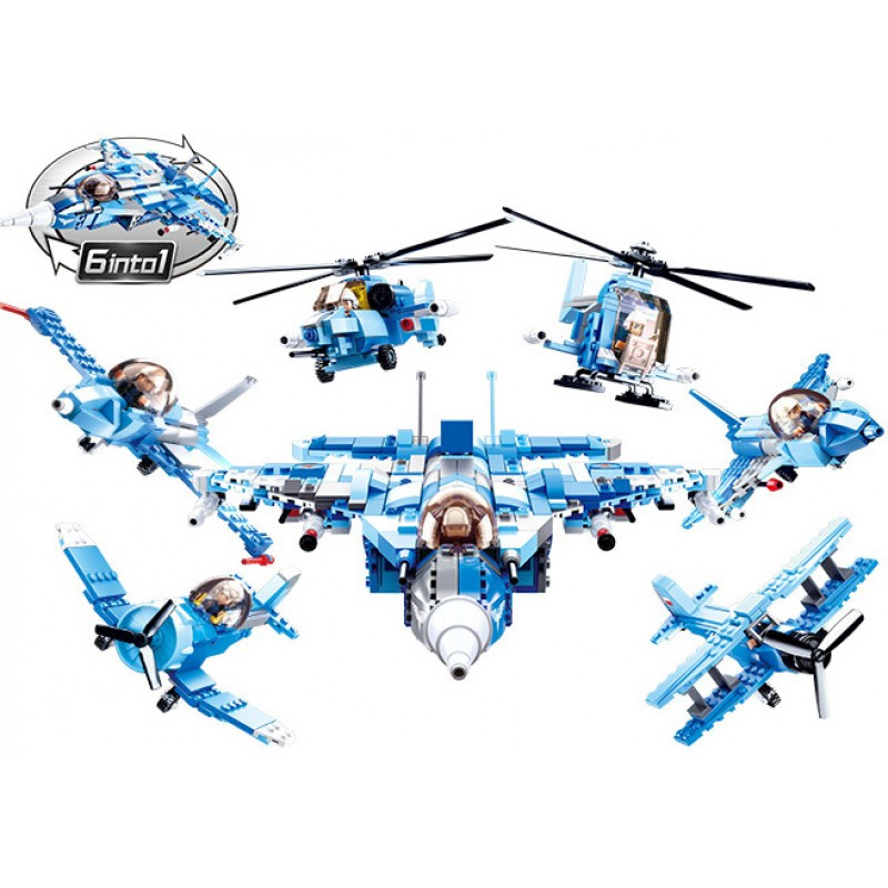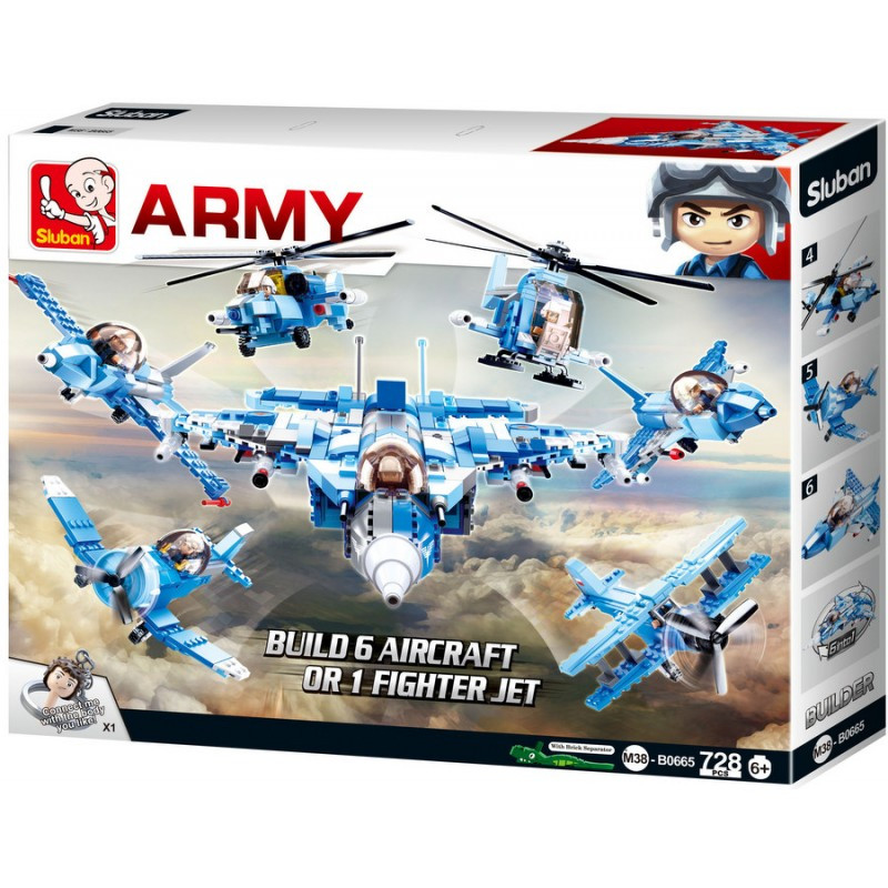Конструктор за сглобяване на 6 различни военни машини или сглобени всички заедно, един голям военен самолет изстребител.