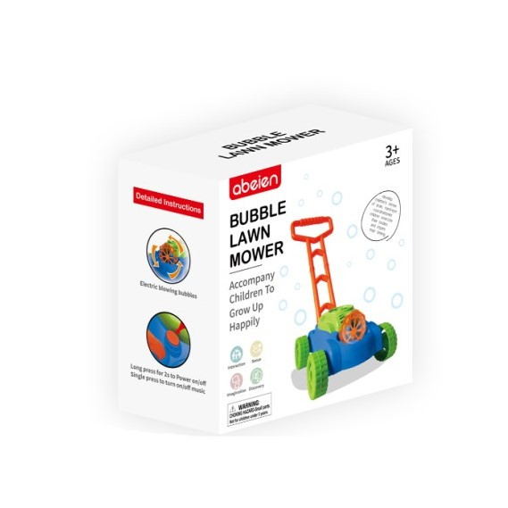 Детска играчка косачка за трева и шише с течност за сапунени мехурчета.