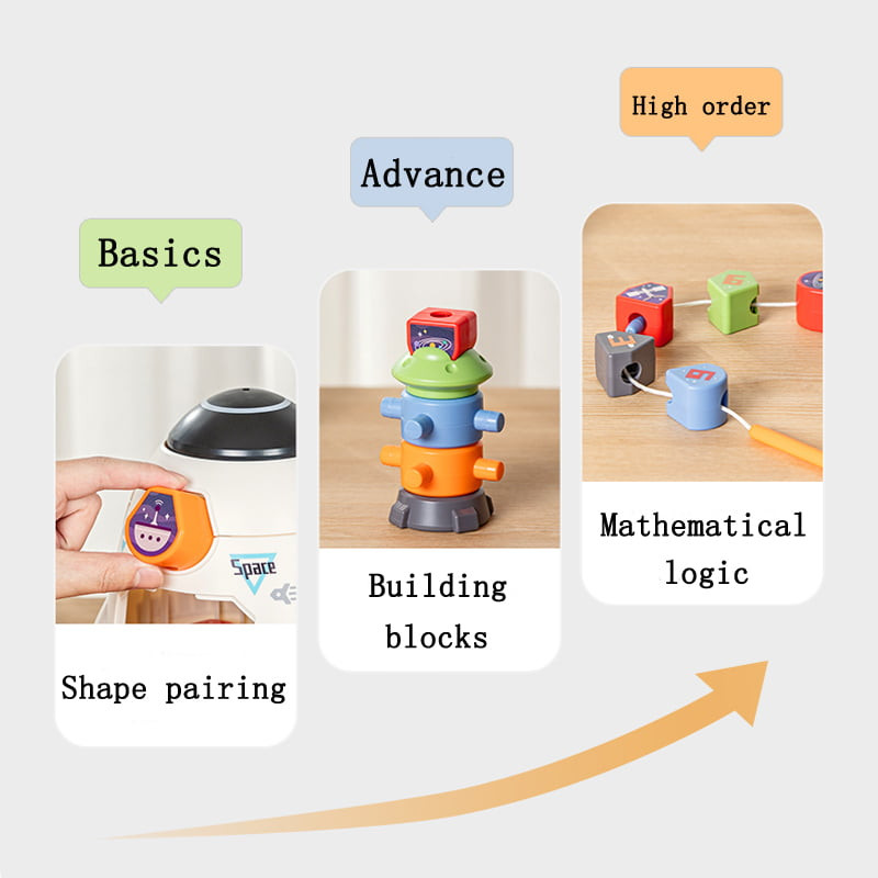 Играта за нанизване подобрява координацията между ръцете и очите, докато децата нанизват геометрични блокчета, развивайки умението за сортиране на форми и разпознаването на цветовете.