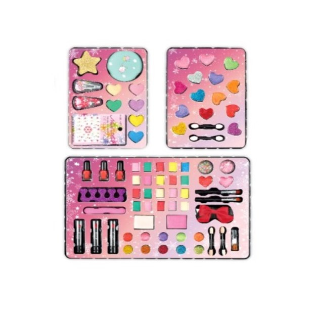 Комплектът включва сенки, ружове, червила, лакове за нокти, стикери, четки и апликатори и други.