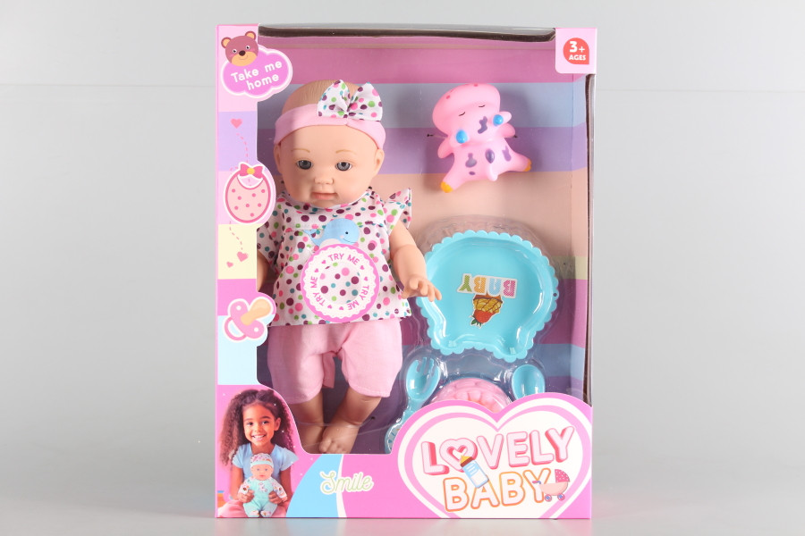 В комплекта са включени играчка за куклата, чинийка, виличка, лъжичка, тортичка.