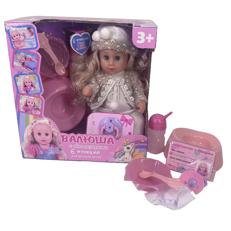 Кукла и комплект с най-необходимите принадлежности - шише, гърне, чиния и лъжичка, чашка, биберон и лична карта.