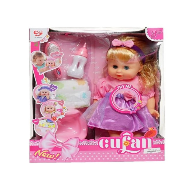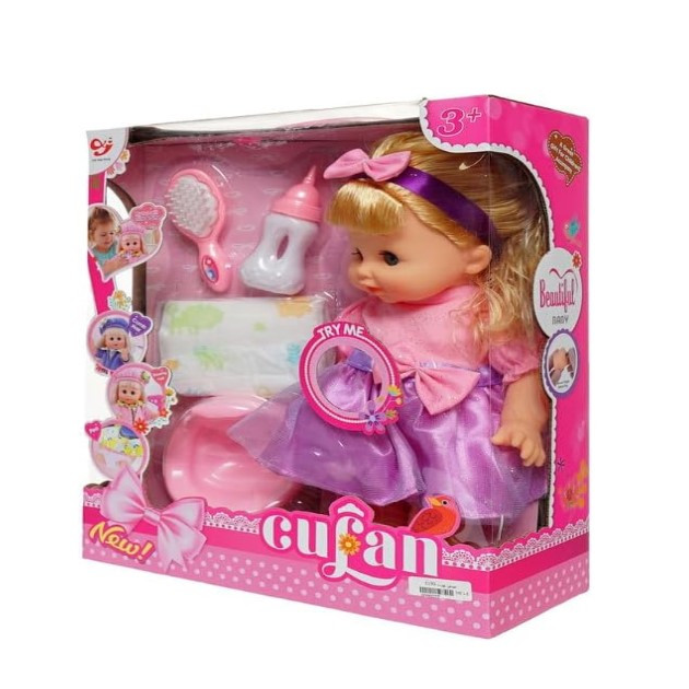 - кукла, памперс, гърне, шишенце, четка за коса.