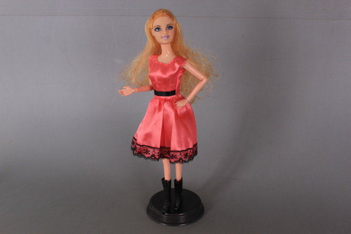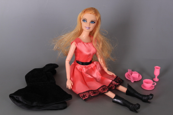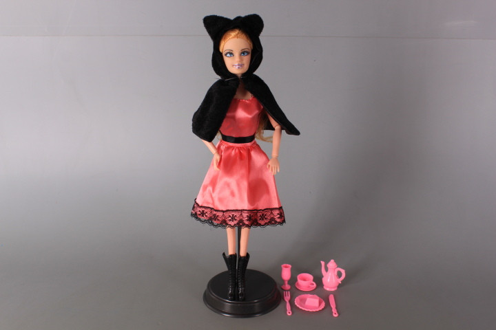 Пластмасова играчка. Комплектът съдържа кукла с чупещи се ръце и наметало, чашка за чай, чинийка, чайник, висока чаша, виличка и ножче. Височина на куклата-29 см. Стойката за куклата е показана с демонстративна цел и не е включена в комплекта! За деца над 3 години.