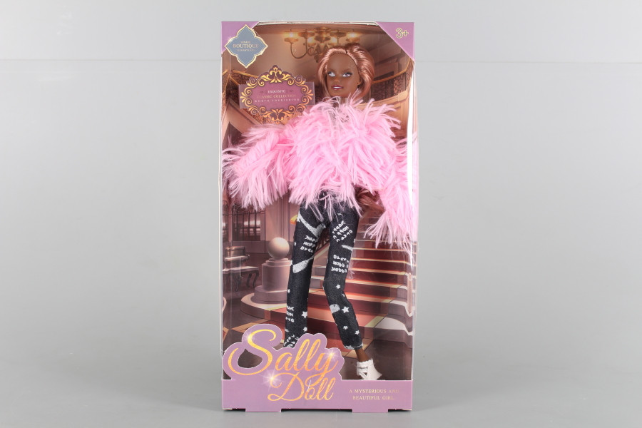 Кукла с дълга коса. Облечена с модерно пухкаво палто и дънки.