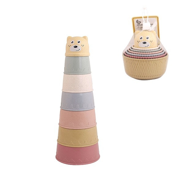 Комплектът съдържа 6 чашки с низходящи размери за подреждане една върху друга или една в друга и формичка на мече за завършек на кулата