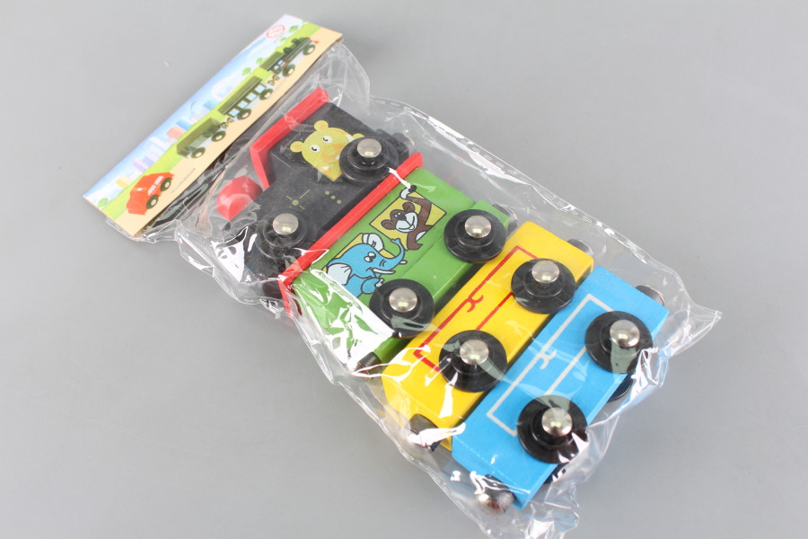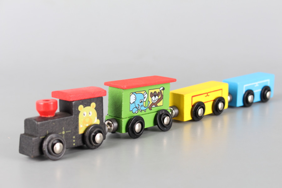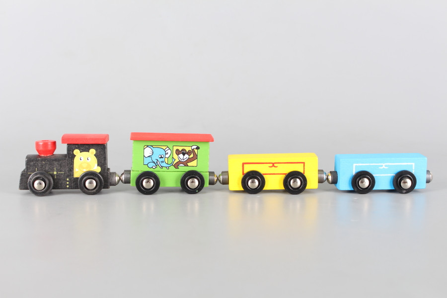 Дървено влакче с локомотив и три вагона, които се захващат един за друг посредством магнити.