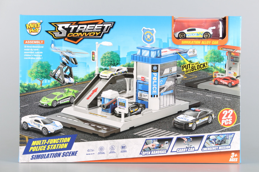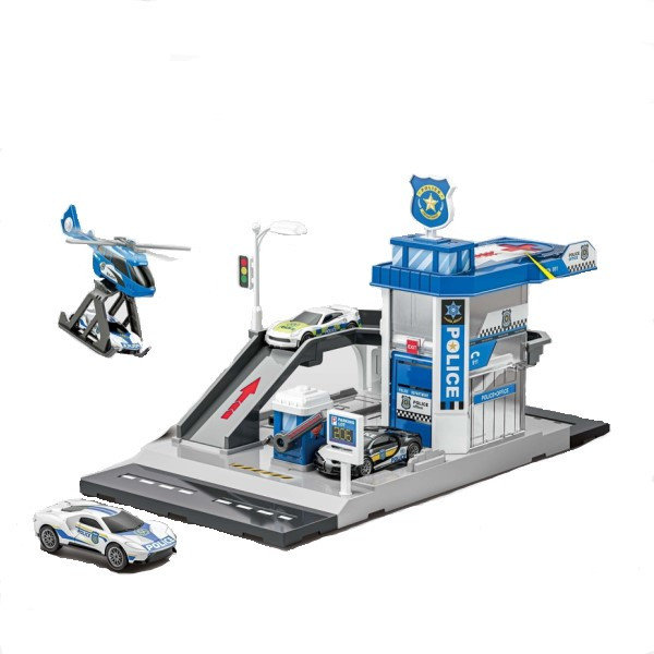 Полицейска база, метална кола и хеликоптер.