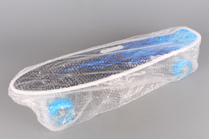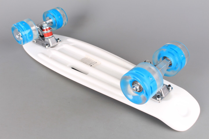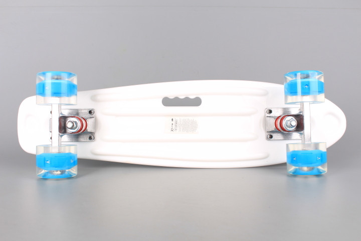 Детски пластмасов скейтборд с 4 светещи гумени колела и метални държачи на колелата.