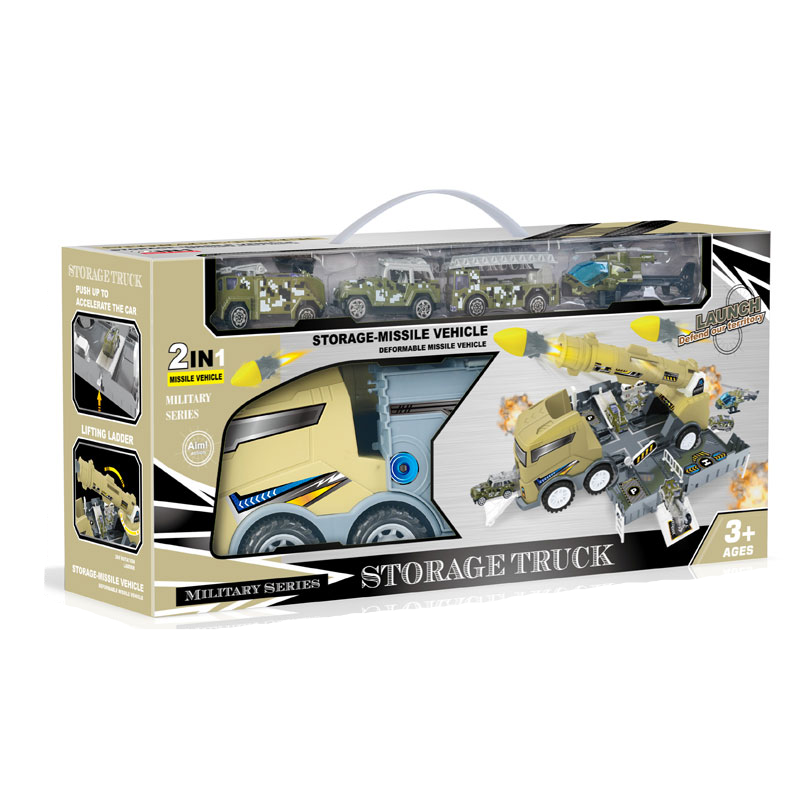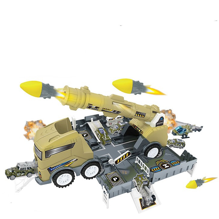 Военен камион трансформиращ се в база с паркинг, хеликоптерна площадка и ракетна машина.
